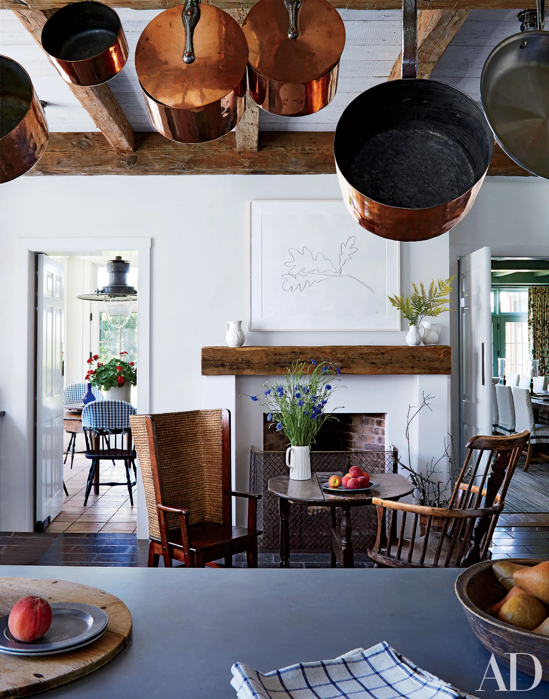 This space designed by decorator Mark Cunningham and architect Hugh Weisman is a Martha’s Vineyard summer home. The Ellsworth Kelly lithograph hung above the fireplace is a nice juxtaposition to the 19th-century tavern table and antique chairs. The opposite view of the same room shown below, shows how the seating area is set just off the kitchen.
